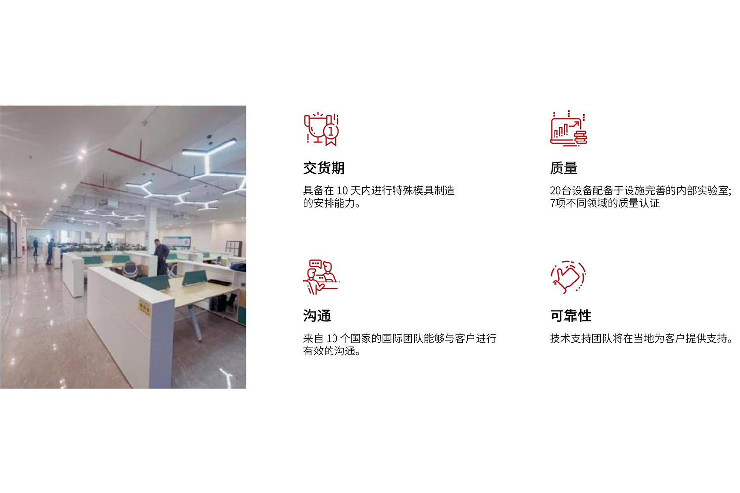 2023年起,我们的越南制造基地配合客户解决贸易战背景下制造多元化的战略需求,拥有模具制造,塑胶注塑,电子成品组装,品质可靠性测试等制造关联服务,配套完善。